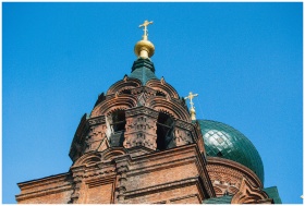 Close-up of the ornate red brick orthodox cathedra
