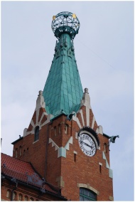 Dramatic view of the Dom Pod Globusem clock tower in Kraków, Poland.