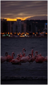 A group of flamingoes wading in water with city lights at sunset in the background.