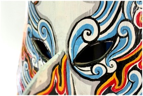 Close-up of a colorful traditional Thai mask featuring intricate patterns and vibrant colors.