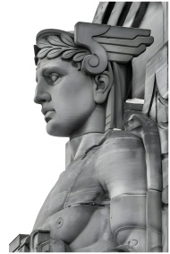 Close-up of an art deco guardian statue in monochr