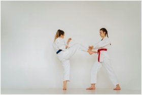 Two women engaged in martial arts training in a studio setting, wearing traditional white uniforms.