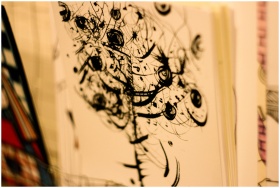 A close-up of abstract ink art on paper with swirl