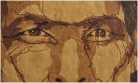 A detailed close-up of a street art mural capturing an expressive face with textured features.
