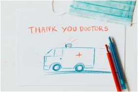 A heartfelt drawing thanking doctors with an ambulance illustration, face mask, and pens.