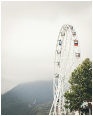 Majestic Ferris wheel shrouded in fog in Sochi, Russia, offering a serene and dreamy ambiance.