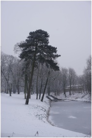 A serene winter scene featuring snow-covered trees and a frozen river in a quiet park.
