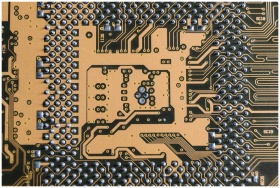 Detailed view of a circuit board showcasing intricate patterns and metallic connections.