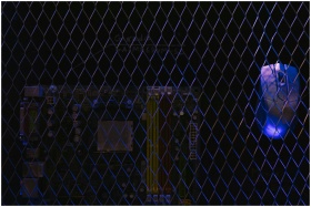 Artistic image featuring a circuit board viewed through a wire mesh, highlighting technology security.