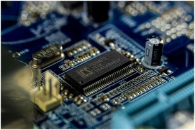 Detailed shot of a microprocessor on a blue motherboard showcasing electronic components.