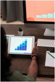 A person reviews statistical graphs on a tablet, showcasing data analysis and technology.
