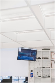 A contemporary office setup featuring a wall-mounted monitor displaying data in a modern interior.