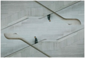 Stylish modern architecture with an intriguing reflection symmetry and lone man walking on stairs.