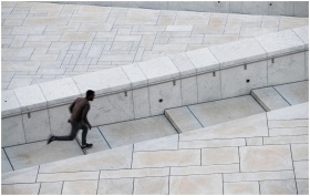 Dynamic shot of a man running up modern urban step