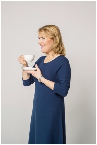 A senior woman in a blue dress smiling while holding a cup of tea, enjoying her drink indoors.