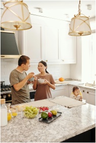 Asian couple and baby dining together in a contemporary kitchen setting.