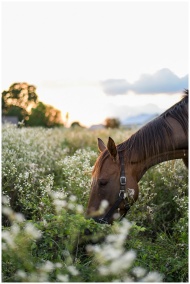 Side view of adult dark brown horse with black straps on muzzle eating grass in field at sunset