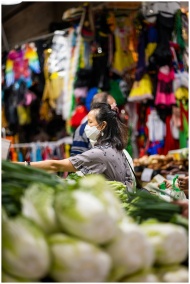 Brunette woman wearing a face mask shopping at a colorful Sydney market. The scene is lively and bustling with fresh produce.