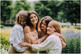 Four women joyfully embracing in a vibrant summer garden, celebrating friendship.