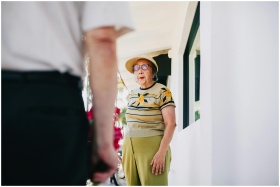 A senior woman is surprised as she receives flower
