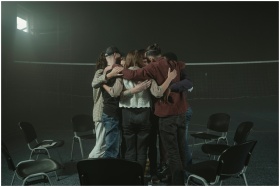 A group of people embracing in a large room, symbo