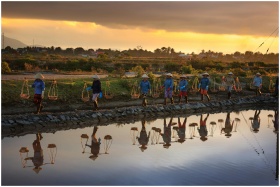 A group of Asian farmers carrying baskets reflecting on a serene waterway during sunset.