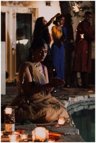 Festive Diwali gathering with traditional attire and candles by the pool at night.