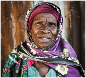Close-up portrait of a senior woman wearing a vibrant headscarf, expressing wisdom and resilience.