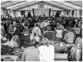 Black and white photo of a large crowd attending a yoga meditation session in Berlin under a tent.