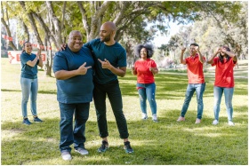 Group of adults engaging in fun team building activities in a sunny park, showcasing teamwork and diversity.