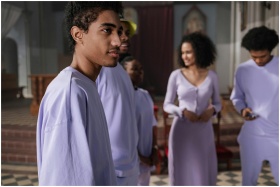 A choir group singing in a church, illuminated by