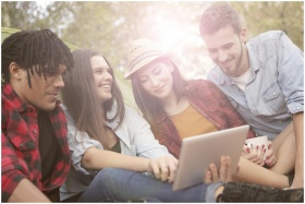 A happy group of young adults enjoying leisure time outdoors, using a tablet.