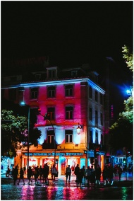 Colorful urban street with neon lights and silhouettes of people enjoying nightlife.