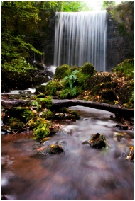 Stunning waterfall flowing through lush forest in Carmarthenshire, Wales.