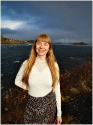 A happy woman in white blouse and skirt enjoys the scenic Icelandic lakeshore.