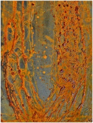 Detailed close-up of a rusty, corroded metal surface showcasing orange oxidation patterns.