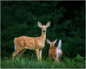 Two spotted deer standing in a lush green meadow, surrounded by a tranquil forest.