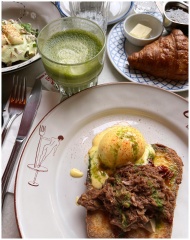 A mouthwatering brunch plate with eggs Benedict, croissant, and green juice.