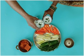 Bright overhead shot of colorful Indian snack plat