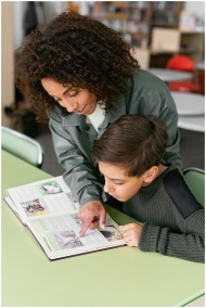 A teacher helps a student read a book at a green table in a classroom, fostering learning.