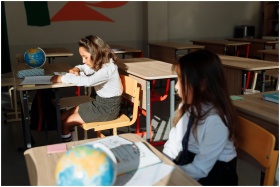 Two young girls focused on their studies in a sunlit classroom with a globe.