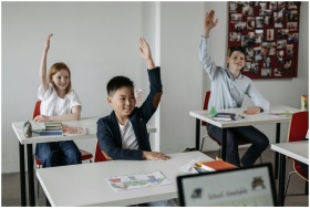 Students in a classroom eagerly raising their hand