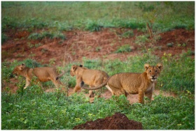 Three lion cubs playing in the lush African savann