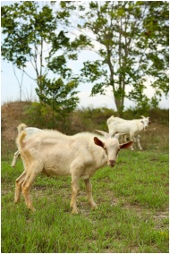 A serene scene of white goats grazing on a green pasture in a rural setting, surrounded by trees.