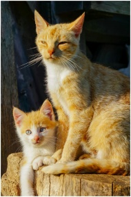 Ginger cat and kitten relaxing on a wooden stump. Perfect for pet lovers and feline enthusiasts.