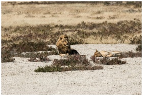 A pair of lions relax in the African wilderness, s