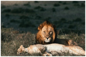 A majestic lion watches over a sleeping lioness on