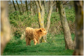 A fluffy Highland cow grazes amidst lush green trees in a sunny Wassenaar park.