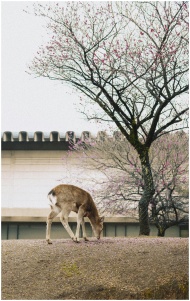 A serene scene of a deer grazing beneath cherry blossoms in Kyoto, Japan, showcasing spring beauty.