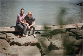 Two men laughing and cuddling on rocks by a rivers